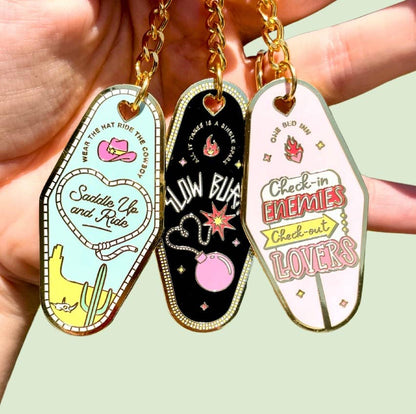 This motel-style enamel keychain is made for romance readers who can’t get enough of Enemies to Lovers— and the only one bed moments that make it even hotter! With gold detailing and unique double-sided designs, it’s the perfect accessory for fans of romantasy. Thoughtful touches like a heart-shaped hole for the keyring add a charming twist, while the key ring + mini lobster clip makes it easy to add to your collection without any extra bulk.